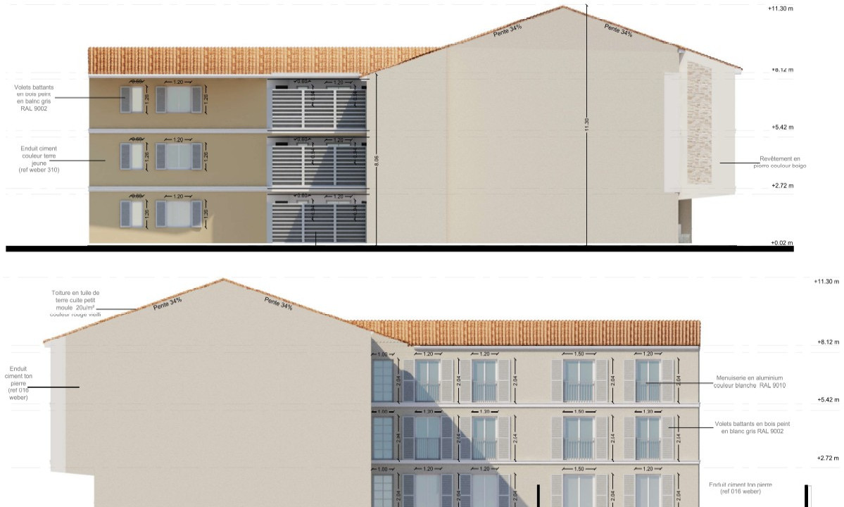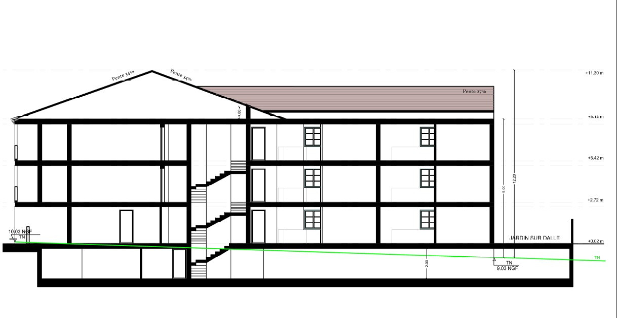 A41369NEM83 - Project involving the demolition of the existing house and its annexes to build a residential building comprising 16 T2 apartments, each with its own parking space. The project includes an underground parking garage, a ground floor, and two upper floors, all covered by a double-pitched roof. The construction is aligned with the current street line in accordance with the local urban planning regulations (PLU). The total plot area is 584 m². This construction project falls within the definition of collective residential buildings.