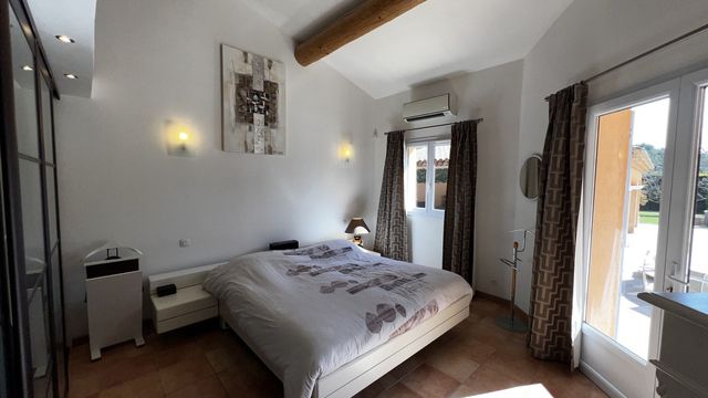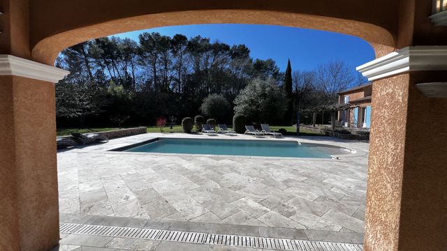 A36151GWI83 - Beautiful Provençal house in Cotignac, close to the village and all amenities. This superb house is located in the heart of a 3,000 m² plot planted with many Mediterranean species. Not overlooked, in a quiet area, it offers a lovely view of the surrounding countryside. The garden has a heated swimming pool (10 x 5 m), a summer kitchen and a pool house with shower room. Main house: entrance, living/dining room with fireplace, south-facing terrace, fully equipped open kitchen and pantry. A master suite: office space, a bedroom with storage, a private bathroom with WC, a second office space. In the other wing of the house, 3 bedrooms with storage, a bathroom, WC and a shower room with WC. A separate duplex apartment (communicating with the main house) for guests includes a living room, an equipped kitchen area, a bathroom with WC and a mezzanine opening onto a large sunny terrace. A carport for 3 cars, a pond and a vegetable garden.