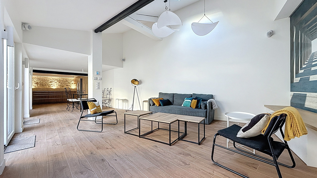 Organised over three levels around a paved courtyard, the house benefits from bright volumes and a well-balanced layout. The ground floor features a generous living space opening onto the courtyard, a fitted and equipped kitchen, as well as a study or guest bedroom with its own shower room.