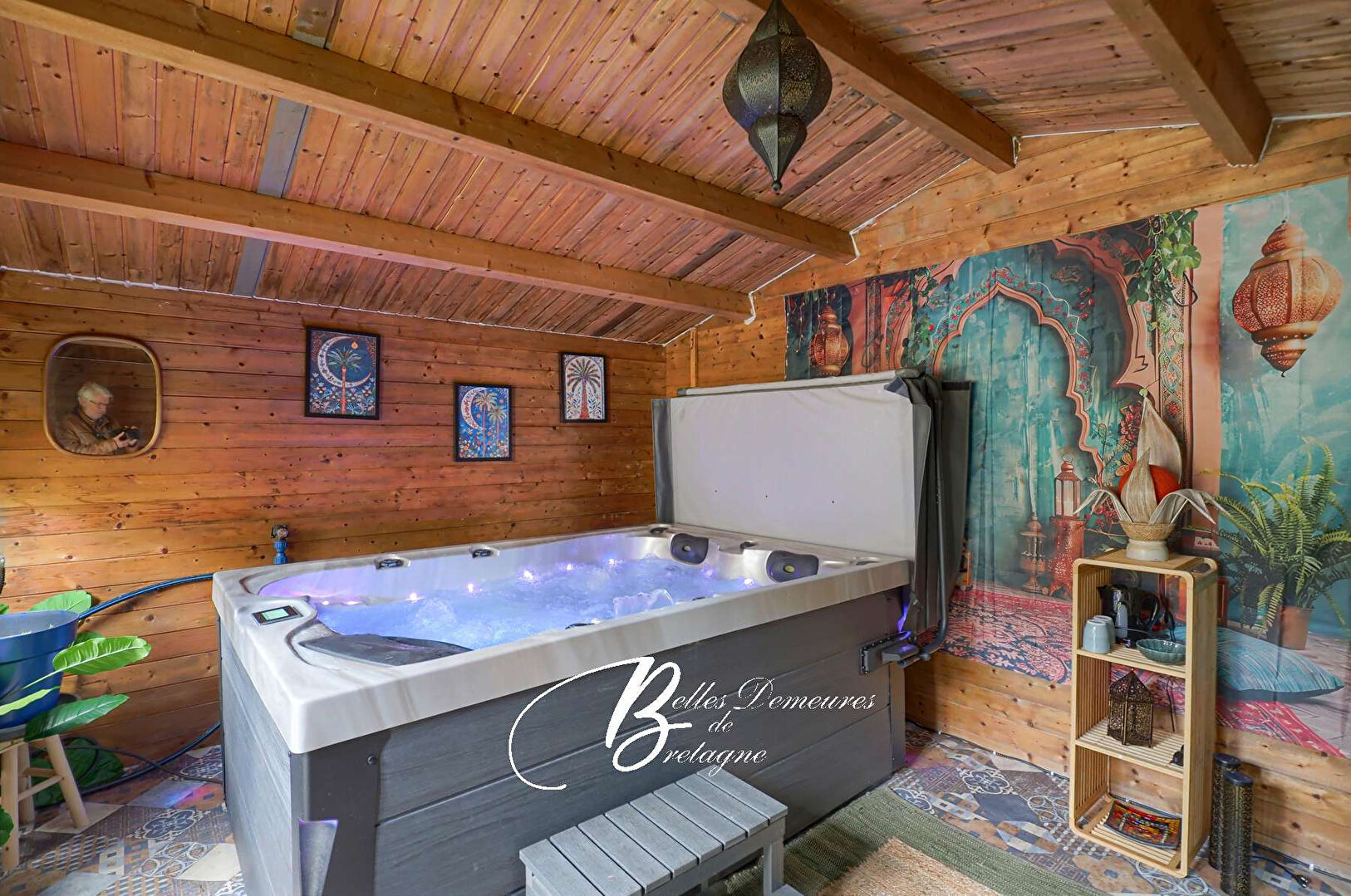 At the rear, a garden chalet equipped with a spa and sauna invites relaxation.
