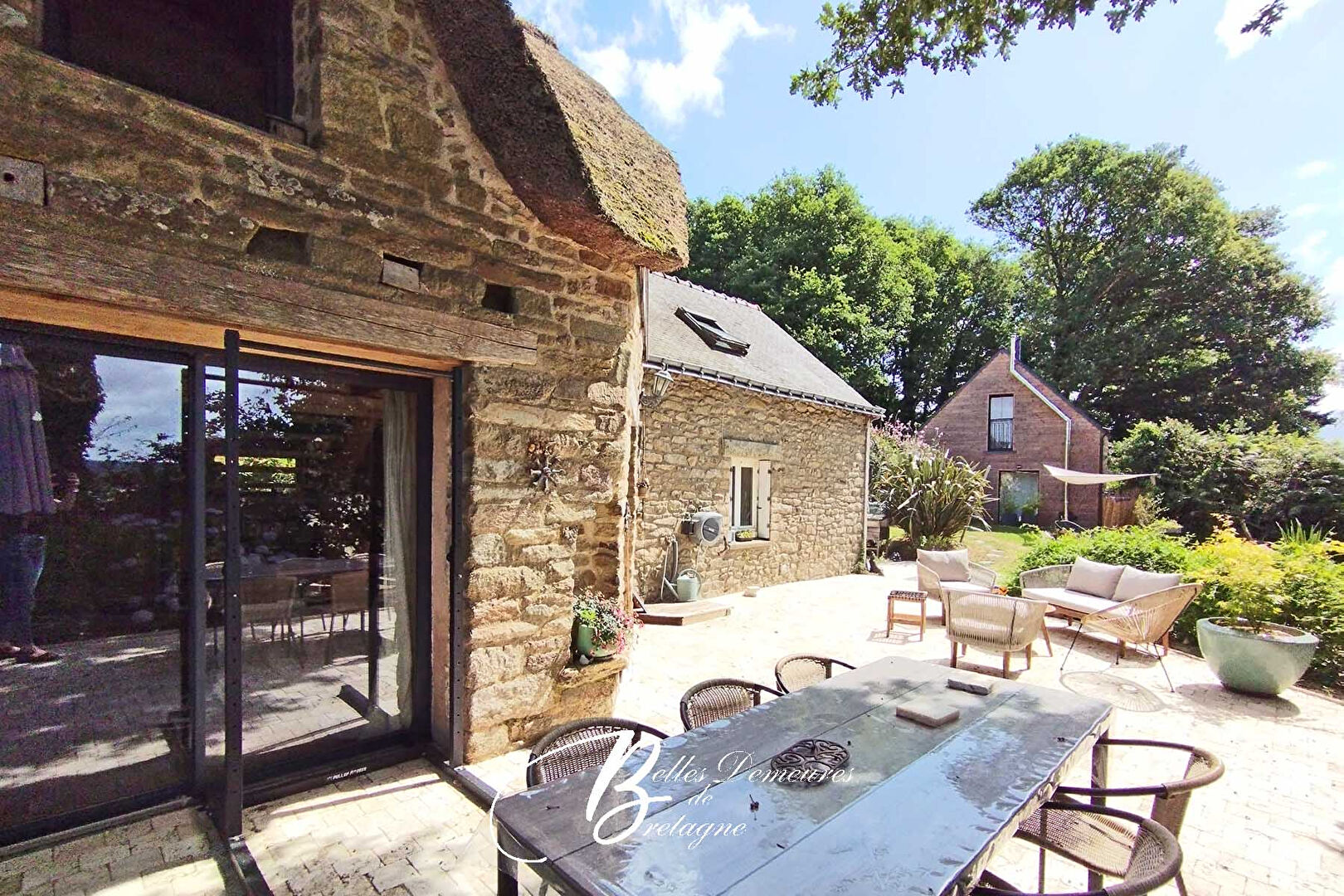 The property consists of a thatched cottage and a gîte renovated a year ago. The cottage, with its unusual layout, has benefited from several extensions over time. The original building houses the kitchen and a bedroom on the first floor. The thatched roof extension consists of a living room with a pellet stove, opening onto the large, recently renovated travertine terrace.