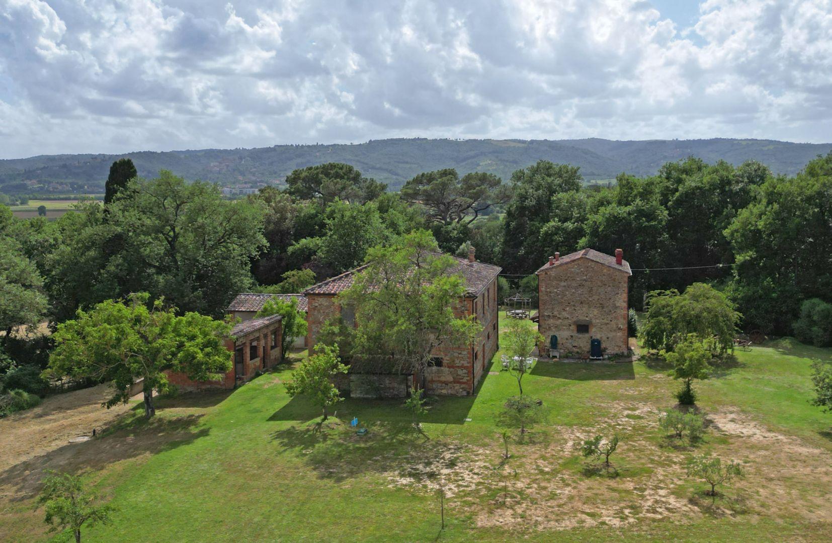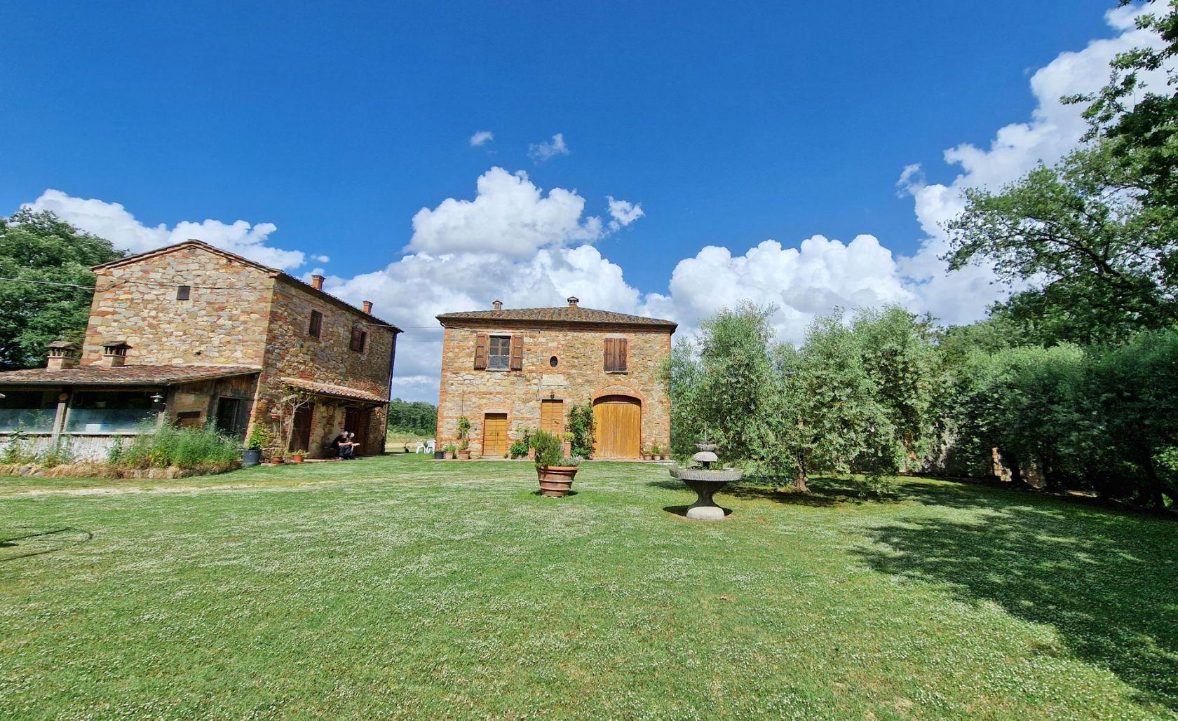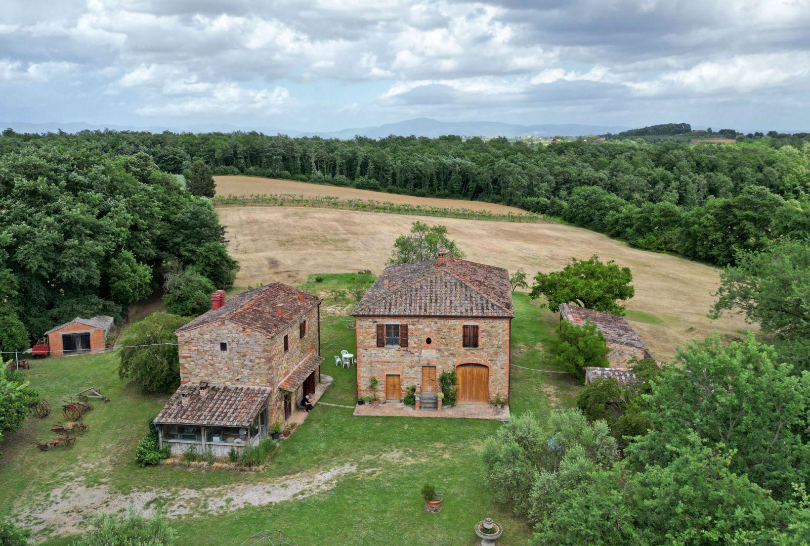 A few kilometers from the pretty village of Lucignano, in the province of Arezzo, in an excellent position among the Tuscan hills, very quiet and peaceful, we find this property consisting of two stone farmhouses with annexes, garden and surrounding land of 4 hectares.