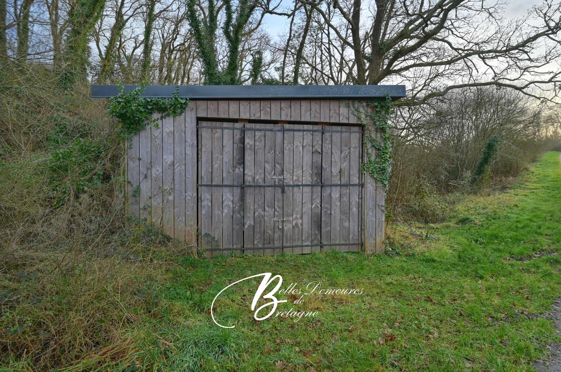 A garage that can accommodate a camper van or a van, as well as a wooded area, complete the whole on the other side of the access road.