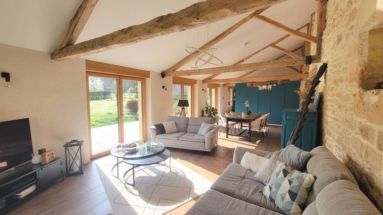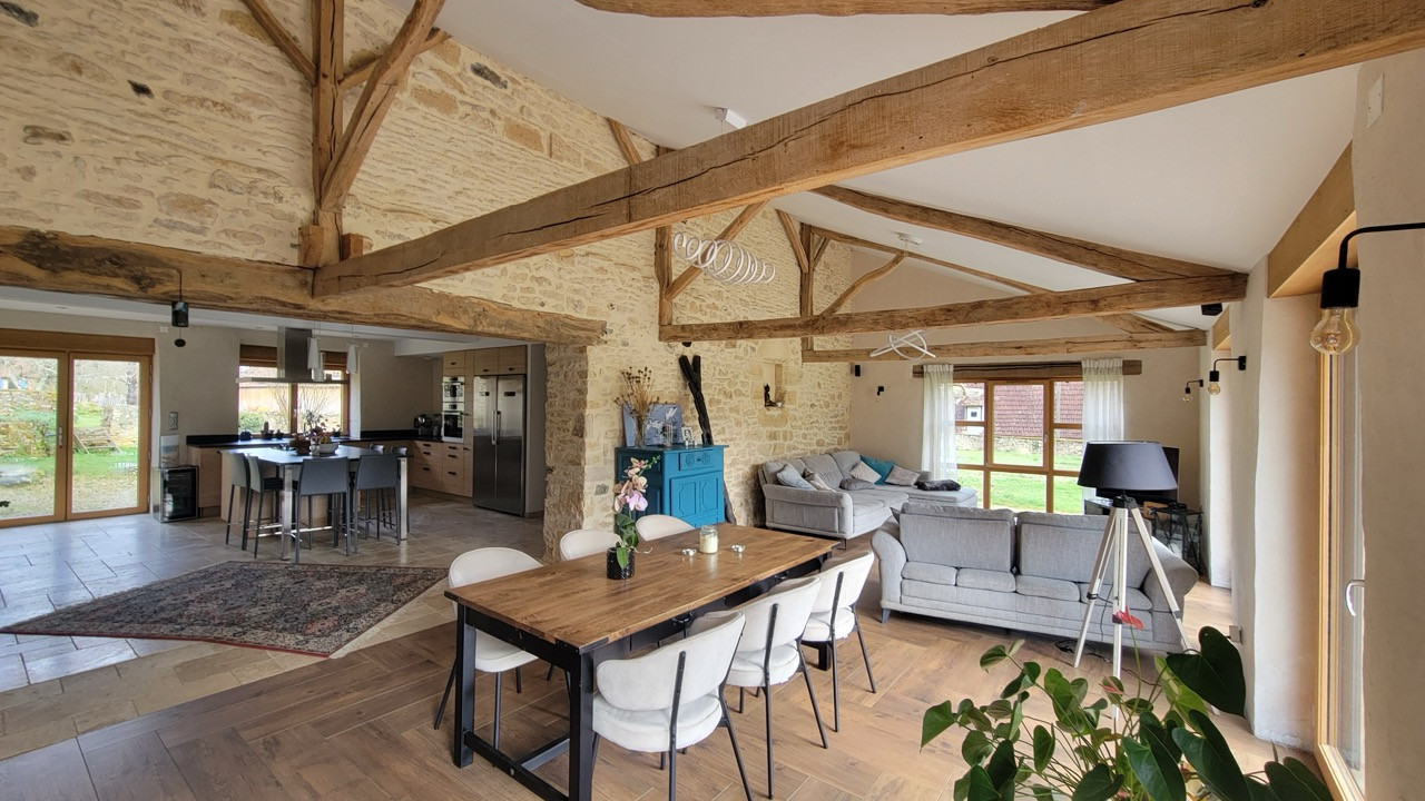- A stunning barn that has been completely renovated and is ideally suited for year-round living. It offers an open kitchen, light-full living, office, a ground floor bedroom and bathroom; on the first floor : 3 spacious bedrooms, a modern bathroom and separate toilet.