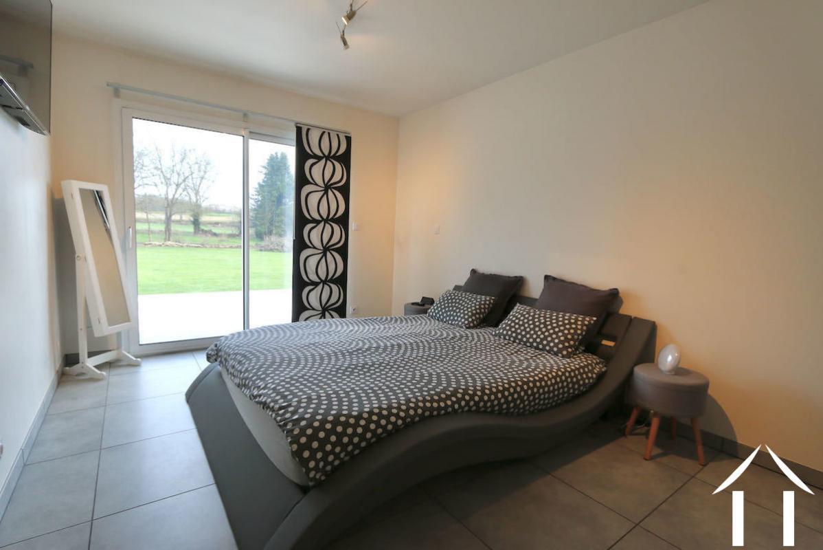 Two bedrooms are 16 m² with closet space and a bay window opening onto the south-facing terrace, and the third, 25 m², currently used as a large office, has openings on the entrance side of the property and a bay window opening onto the terrace. The shower room is very large, having been designed to accommodate a sauna. If desired, a large bathtub could be installed in addition to the shower, which is designed to accommodate a wheelchair. Outside, the L-shaped terrace wraps around the house to the south and west, with a view over the large lawned garden bordered by the Cozanne, the small river that runs through Nolay.