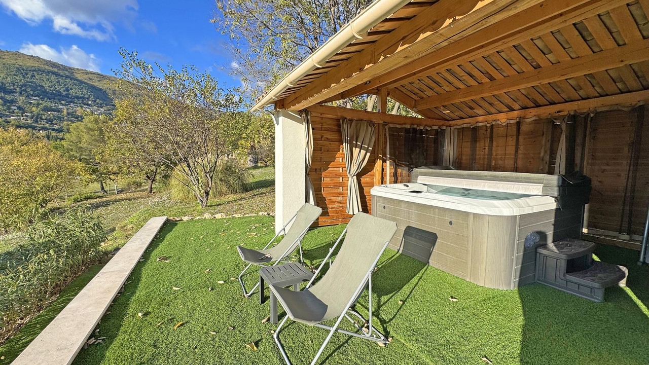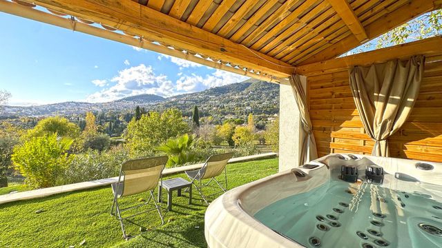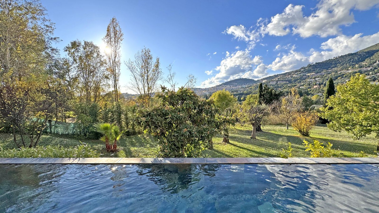 Outdoors, an inviting Bali tiled swimming pool, covered spa, barbecue terrace, garage, and multiple parking spaces complete this peaceful hillside retreat, an ideal Côte d'Azur residence for year round living or refined holidays.