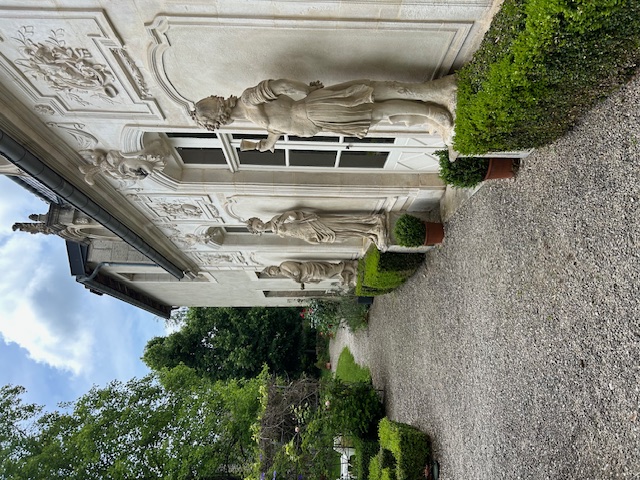There are numerous fruit trees, boxwood beds and a lawn.