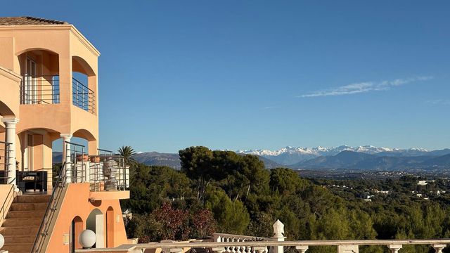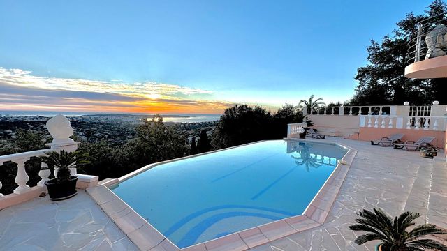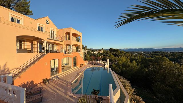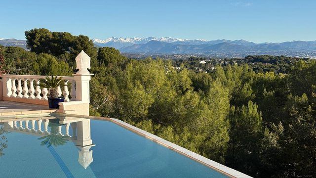A41473SMG06 - Perched in the hills of Vallauris, this timeless Provençal villa boasts one of the most spectacular panoramic views on the Côte d'Azur, capturing the sea from Cap d'Antibes to the Bay of Angels and the distant Alpine peaks. Offering over 300 m² of adaptable living spaces, the property includes a double reception, multiple terraces, an authentic kitchen, and a private two bedroom guest apartment. The master suite enjoys its own terrace and vast dressing area, with further bedrooms ideal for family or guests. Outside, a stunning 14m infinity pool blends seamlessly into the Mediterranean horizon, creating a truly magical outdoor setting. With garages, plentiful parking, and scope to complete an additional independent apartment, this villa offers both luxury living and exciting potential in a peaceful yet perfectly connected location.