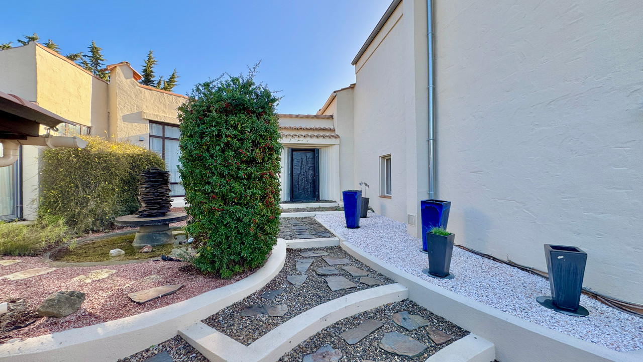 A42540IEG11 - Set in a commanding position in the heart of the Minervois, this architect-designed villa enjoys panoramic views and absolute privacy within 4,560 m² of fully enclosed landscaped grounds. The property combines refined architecture with noble materials, including solid oak floors, wooden staircases and large timber-framed windows opening onto the surrounding vineyards.