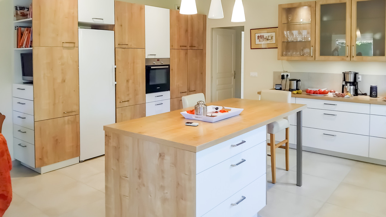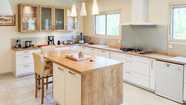 The first house (184 m²) features on the ground floor a fully equipped kitchen (29 m²), a living/dining room, a pantry, a laundry room, and a separate toilet.
