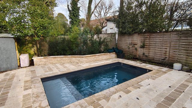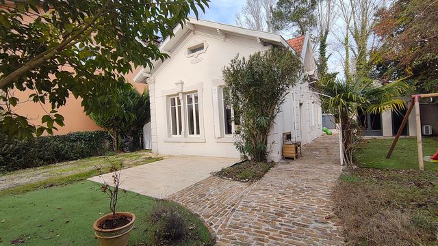 A42266BTU33 - Arcachon-style home ideally located in Talence, just minutes from Bordeaux, near the University of Bordeaux and KEDGE Business School with easy public transport access. Recently remodeled since 2021, it offers four bedrooms (two on the ground floor, two upstairs), an open modern kitchen, and a bright living and dining area. The property, with 125 m² of livable space (110 m² Carrez, also includes a separate air-conditioned office suitable for remote work or guests. Set on a central plot, it features parking for three cars, a heated swimming pool, and an 18 m² outbuilding for additional space or storage.