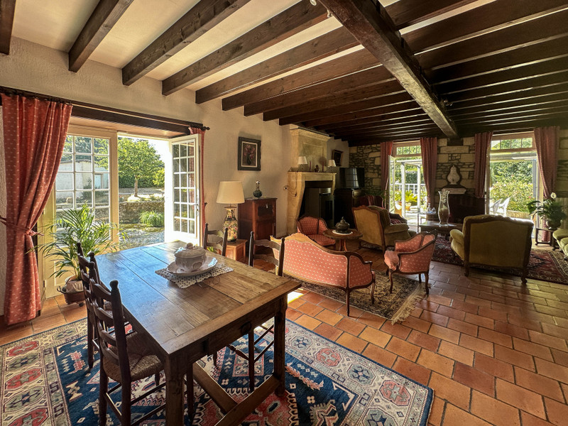 French doors open to the large living room of 50m2 which has a pellet burner and original fireplace .