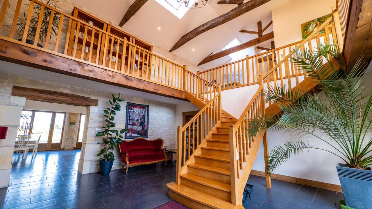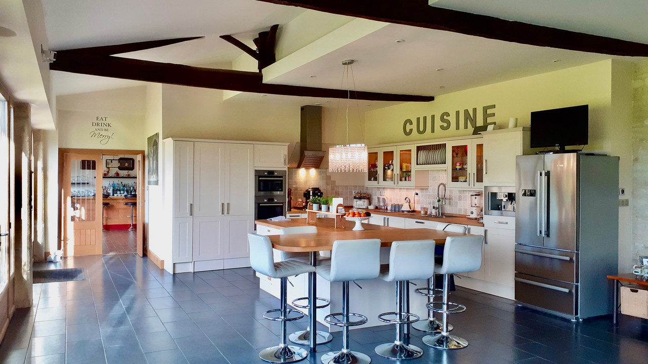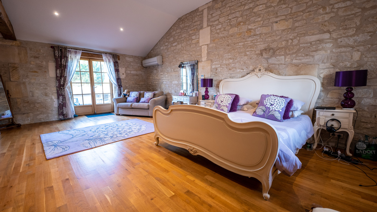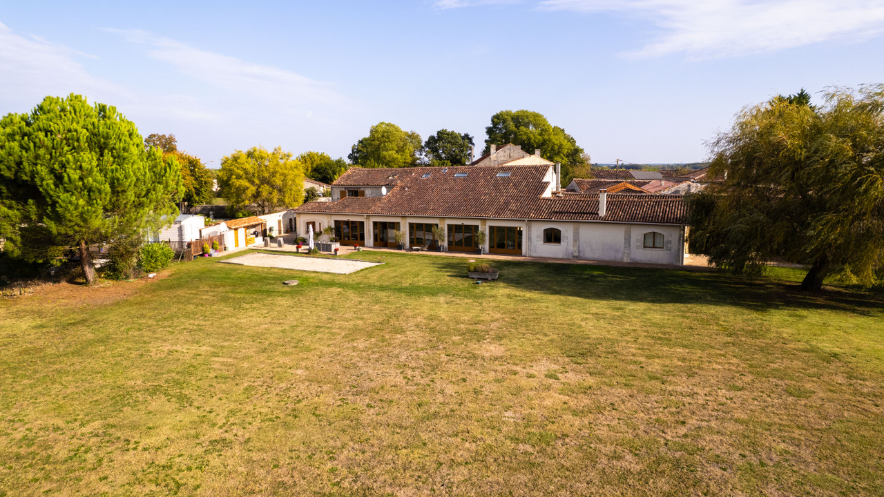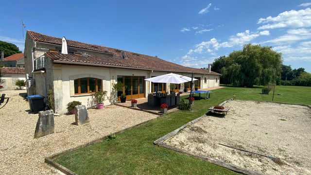 A18128ANB16 - This beautifully converted barn in the heart of the Charente region, offers fabulous open plan living and has been finished to an exceptional standard. On the ground floor there is a fabulous open plan kitchen with vaulted ceiling and views onto the garden, living room and 2/3 bedrooms and games room which can be separated from the main house and are currently let as holiday accommodation with fantastic 9.9/ 10 rating on Booking.com. On the first floor there is an impressive mezzanine landing and a further 3 double bedrooms, one with private outside terrace.
