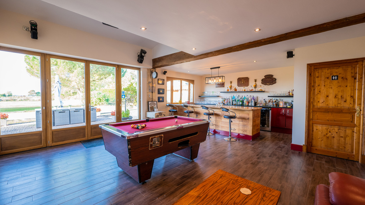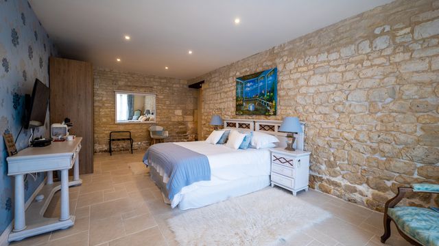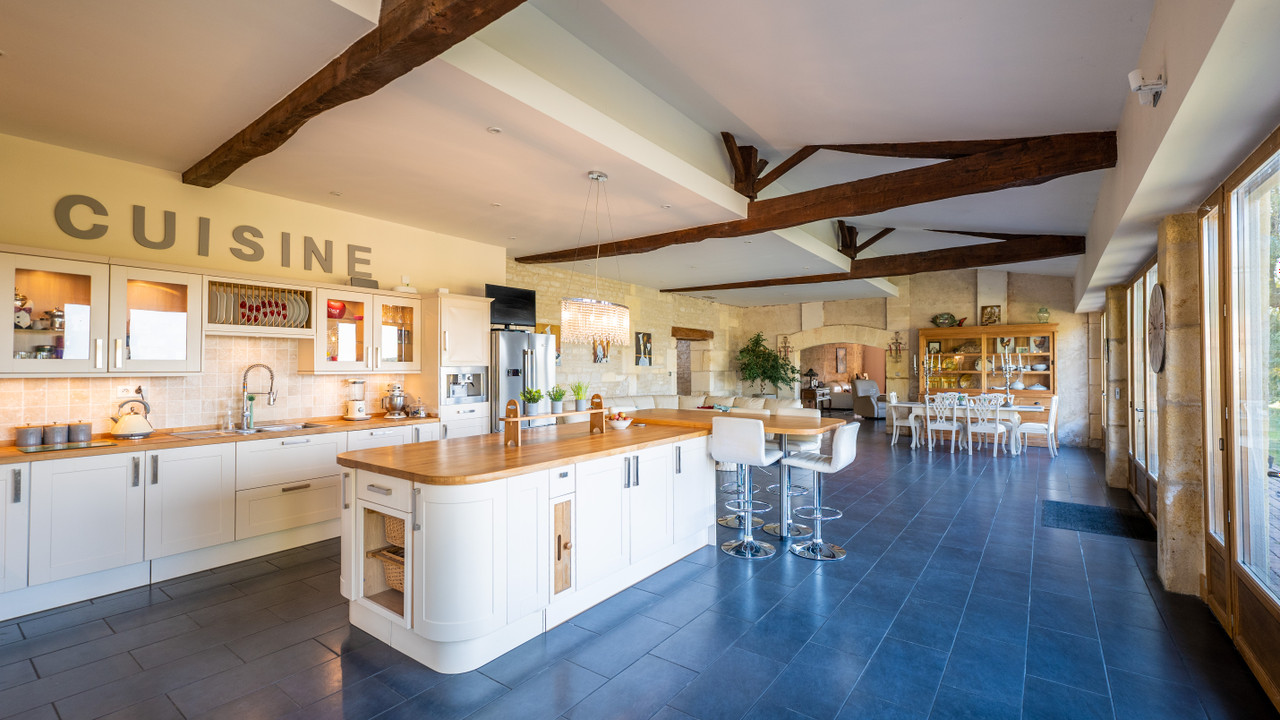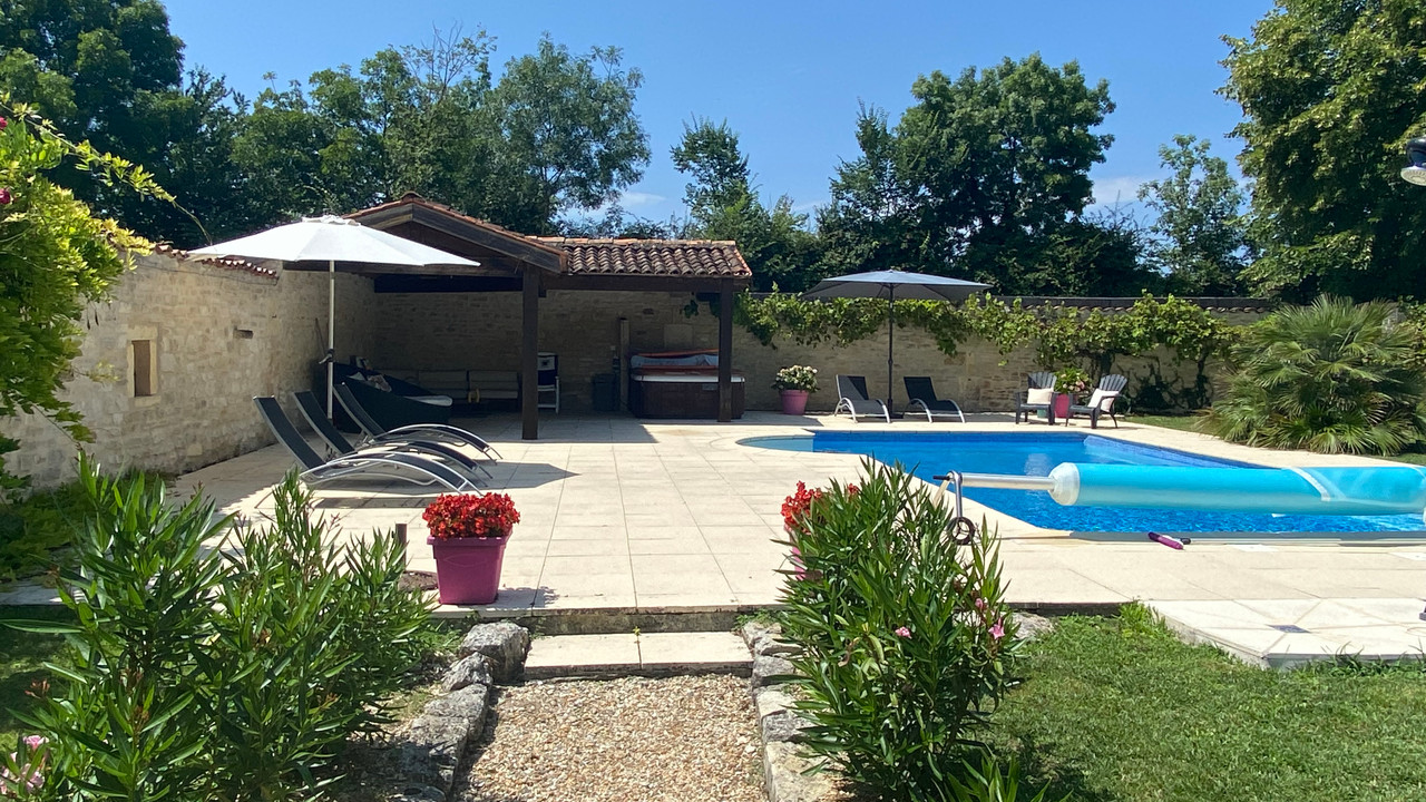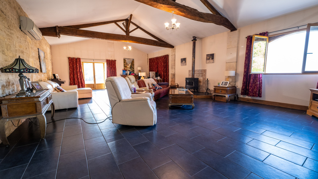 A18128ANB16 - This beautifully converted barn in the heart of the Charente region, offers fabulous open plan living and has been finished to an exceptional standard. On the ground floor there is a fabulous open plan kitchen with vaulted ceiling and views onto the garden, living room and 2/3 bedrooms and games room which can be separated from the main house and are currently let as holiday accommodation with fantastic 9.9/ 10 rating on Booking.com. On the first floor there is an impressive mezzanine landing and a further 3 double bedrooms, one with private outside terrace.