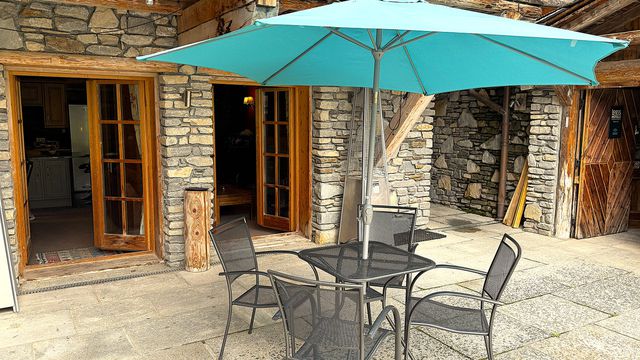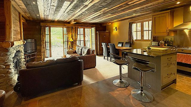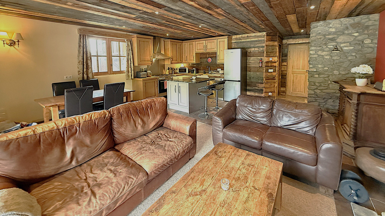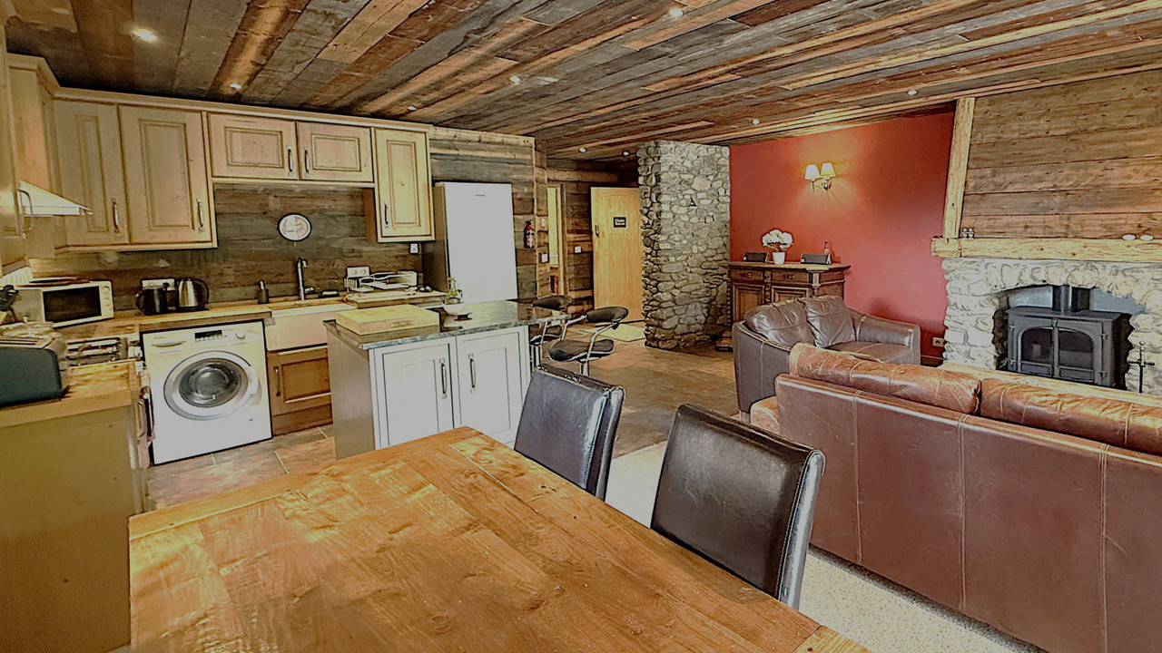 A37755JQB73 - Located in the heart of the Bataillette area of Sainte Foy Tarentaise a Large traditional Savoyarde style 1-bedroom apartment comprising an open plan living room with stone built fireplace and log burner, a fully equipped kitchen with island, a dining area with mountain views, a double bedroom with terrace to the north and a large bathroom.