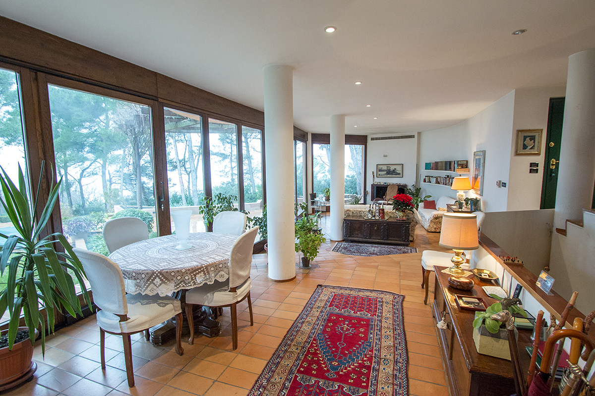 Sold ID: 134077This architecturally interesting villa, which was built in 1997, is completely surrounded by a 0,5 Ha forest in the Park del Conero, about 200-250 m above sea level, just 10 km from Ancona, 3 km from the sea and 15 minutes the motorway exit.