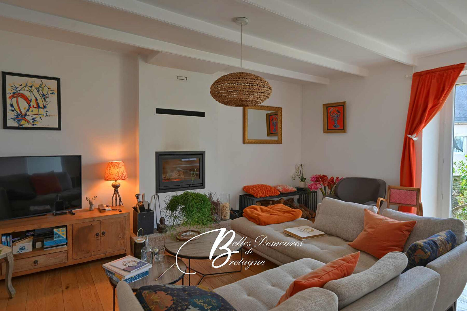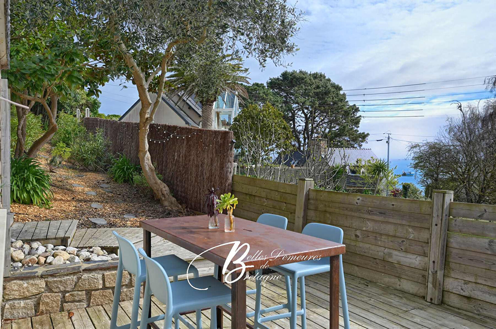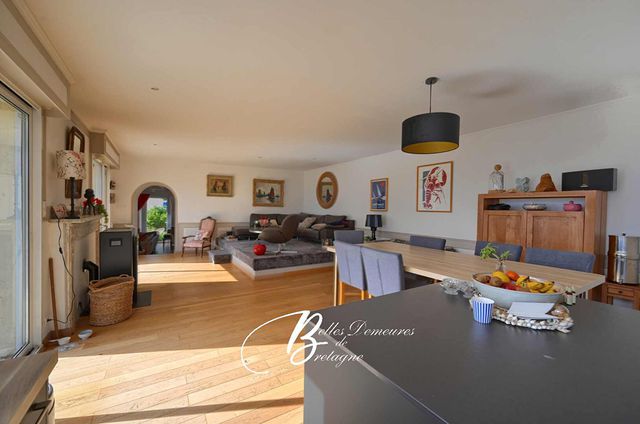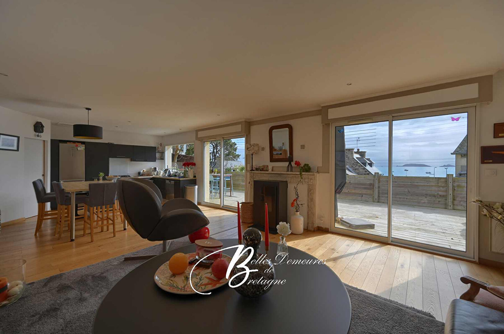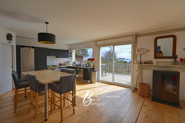 Le cœur de la maison se trouve dans ses espaces de vie : un salon plus intime avec sa cheminée-insert, puis un vaste salon-séjour baigné de lumière, prolongé par une cuisine ouverte. L’ensemble compose un lieu convivial, prolongé par une grande terrasse en bois pensée pour profiter pleinement de la vue mer et du rythme du petit port.