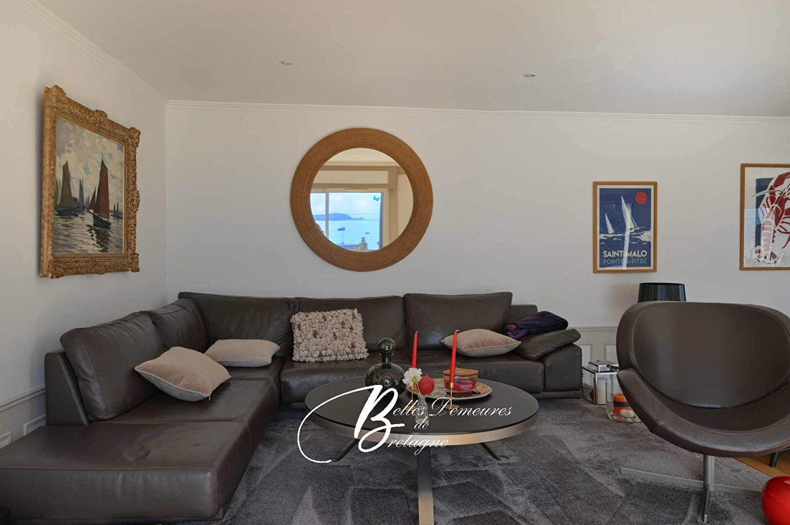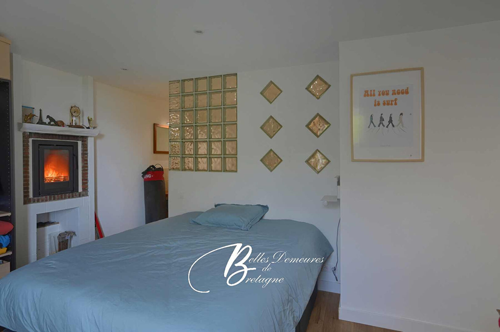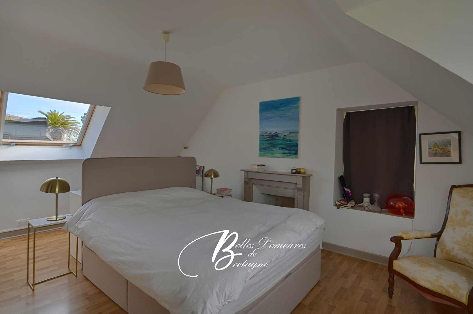 Le cœur de la maison se trouve dans ses espaces de vie : un salon plus intime avec sa cheminée-insert, puis un vaste salon-séjour baigné de lumière, prolongé par une cuisine ouverte. L’ensemble compose un lieu convivial, prolongé par une grande terrasse en bois pensée pour profiter pleinement de la vue mer et du rythme du petit port.