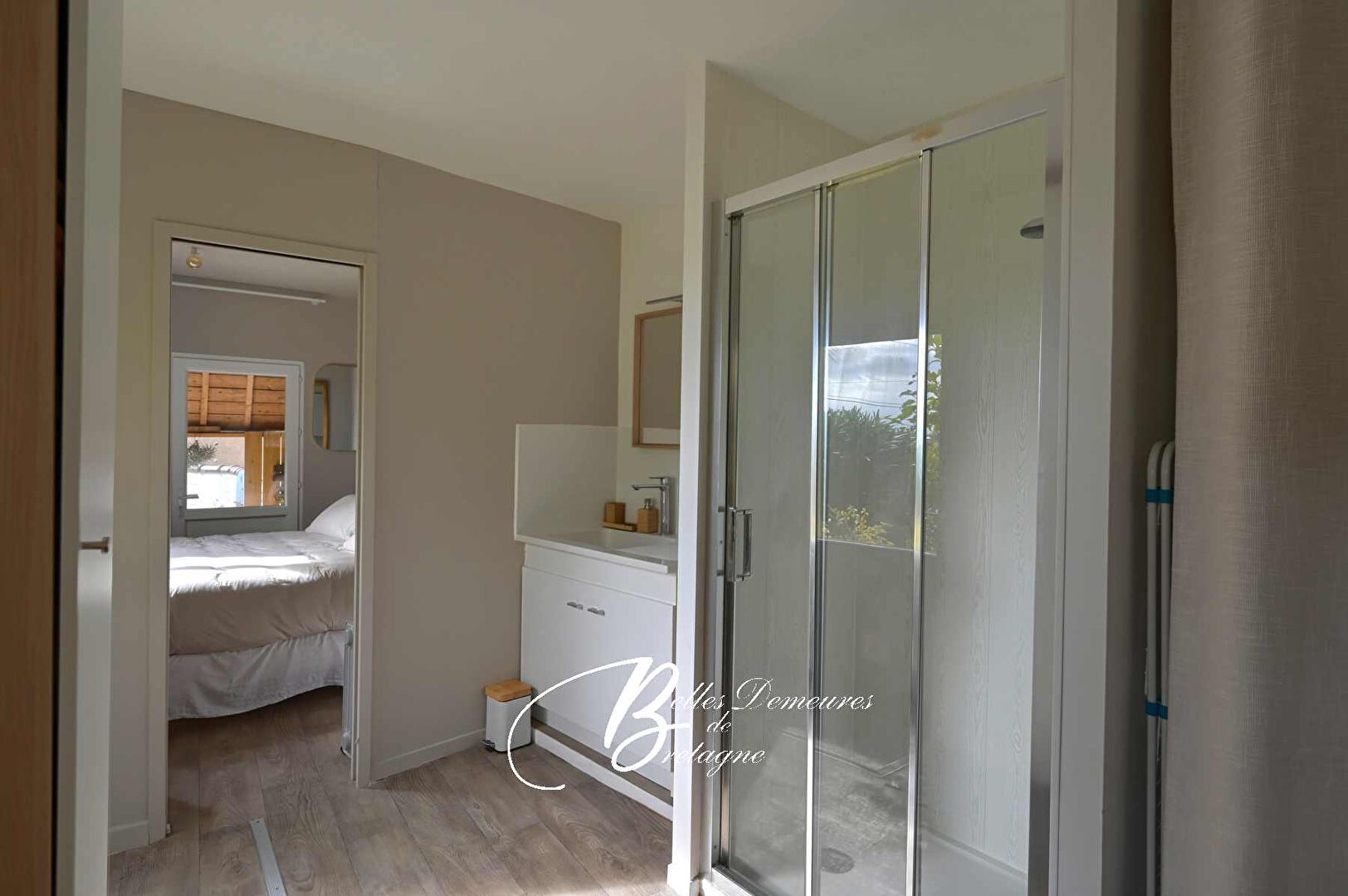 La porte franchie, un hall accueillant distribue un vestiaire, un WC avec lave‑mains, puis s’ouvre sur une première chambre dotée de sa salle d’eau privative. Plus loin, une seconde salle d’eau-buanderie avec WC jouxte une autre chambre, idéale pour recevoir famille ou amis.