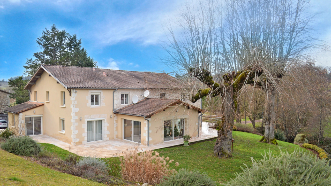 On the banks of a river, in an enchanting bucolic setting, discover this fully renovated stone mill. This rare property offers a large, bright living room and a kitchen-diner opening onto a terrace with stunning views. It has four bedrooms, including a ground-floor suite, and a wellness area with a jacuzzi.