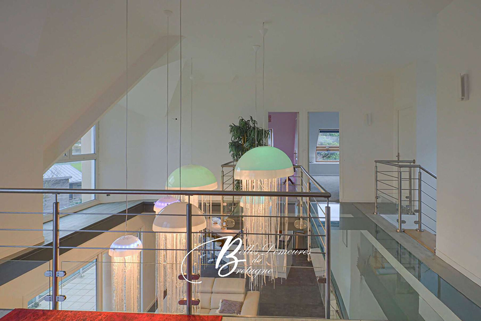 Upstairs, a mezzanine overlooks the living room and offers a spectacular panoramic view thanks to its glass floor, a veritable skylight that diffuses a unique atmosphere. This airy space, bathed in light and emotion, extends into an office open to the horizon. An inspiring place where it will be almost impossible to work, so irresistibly does the sea draw the eye. It leads to a second sleeping area with two bedrooms, a bathroom, and a toilet.