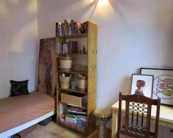 Escaleras en el hall de entrada conducen a la primera planta. A la izquierda está la sala de estar con grandes puertas de madera que dan a un balcón soleado con vistas al patio de abajo y mira hacia el otro balcón en frente. De vuelta a las escaleras, un pasillo conduce a la derecha pasó las escaleras hasta el cuarto de baño de arriba con ducha / bañera. Más abajo, a la derecha, está el dormitorio principal con cuarto de baño con ducha y, a la izquierda, a través de una puerta, está el segundo balcón. Una puerta conduce al cuarto dormitorio, muy espacioso. Esta habitación tiene una bonita ventana y un escritorio desde el que se puede ver una vista parcial de la Alhambra, así como unas escaleras que conducen a la terraza de la azotea. La terraza de la azotea tiene una vista parcial de la Alhambra, así como de Sierra Nevada y el barrio del Albayzín.
