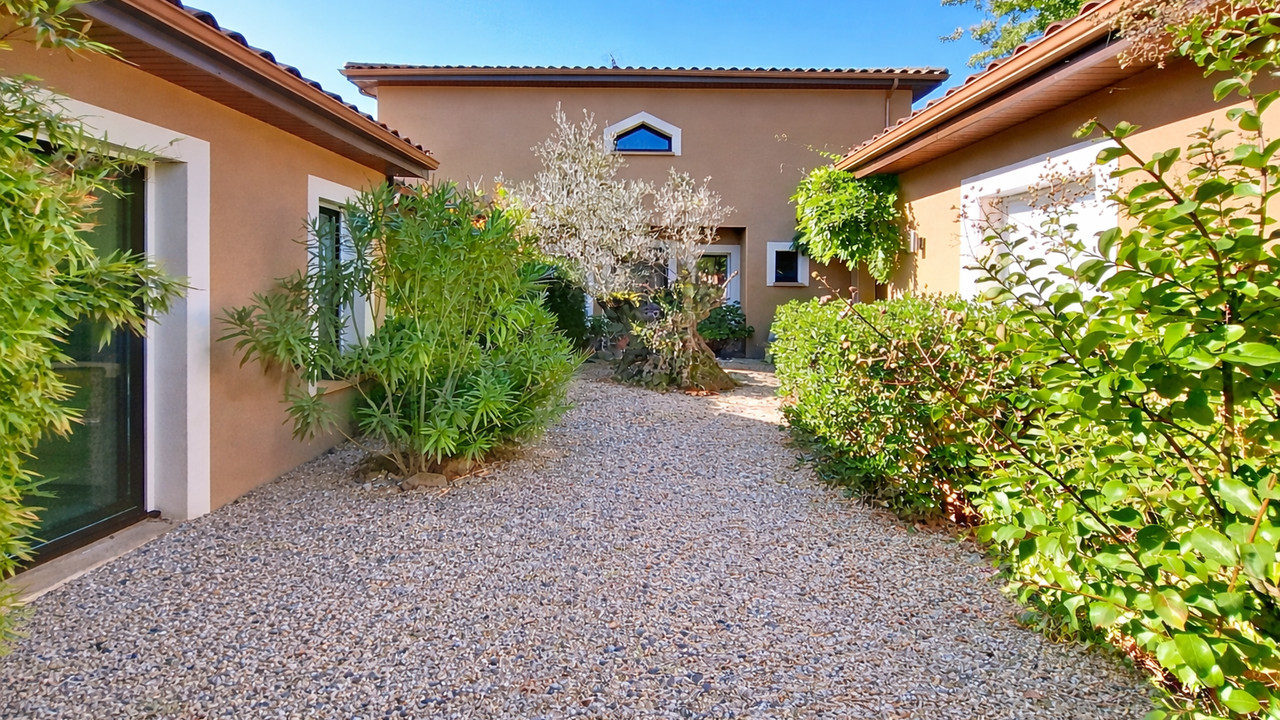 A42463DVI69 - Nestled in a sought-after residential area, this 308 sq m architect-designed house captivates with its contemporary elegance, enhanced by refined Asian influences. Two antique doors brought from India and Rajasthan, along with a thousand-year-old olive tree at the center of a spectacular patio, lend the property a rare and unique character.
