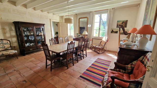 The main house offers adjoining reception rooms with southern exposure. In the living room, dining room, and entrance hall, you'll find exposed stone walls and Gironde tiles.
