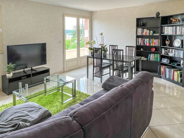 Living room (30,70 m²) with pellet burner , French windows opening to private balcony with views