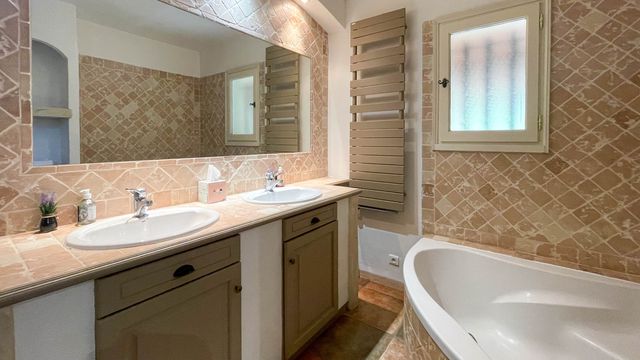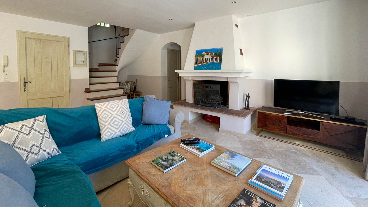 The property benefits from air-conditioning, an open fireplace and high ceilings with exposed beams.
