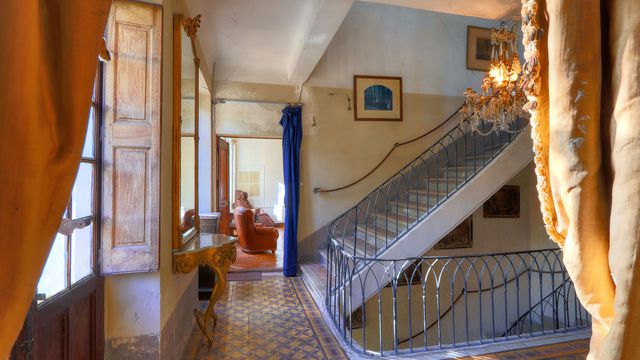 The property overlooks its land, backed by oak and pine woods, with a total area of about 84 hectares.