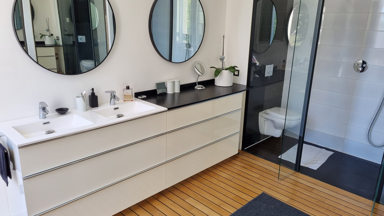 Jack & Jill bathroom with built-in wardrobes, walk in shower, toilet and basins;