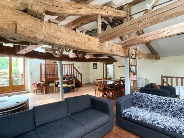 The adjacent old mill (gite) can be accessed either through its own entrance or from the kitchen of the cottage and consists of a stunning living room with the mill's mechanisms still in place (69 m²) From this room, a staircase leads to the garden level where you will find a double bedroom (15 m²) a small children's bedroom (6 m²) a bathroom (7 m²) and a kitchen (9 m²)
