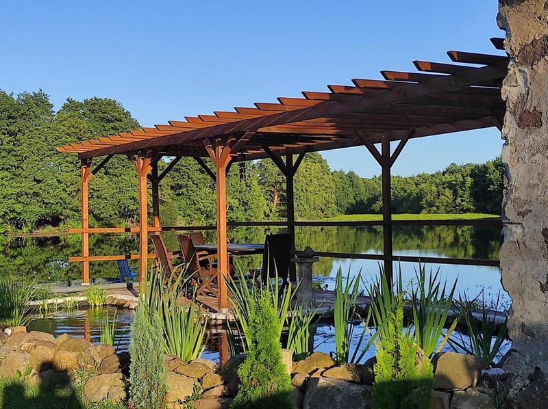 The exterior is just as enchanting with a small orchard and of course the lake with its dock and its covered terrace overlooking the lake, ideal for relaxing and enjoying the stunning views.