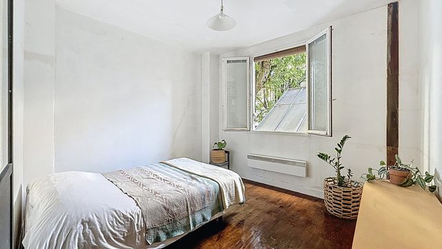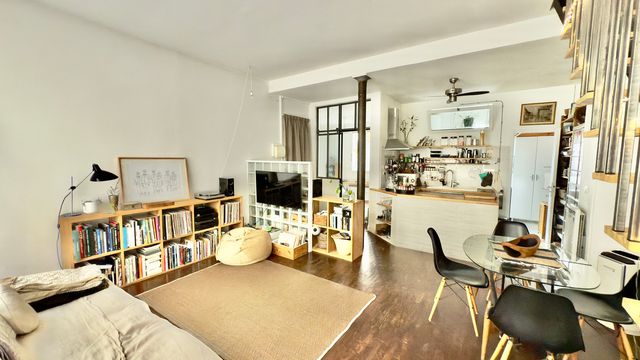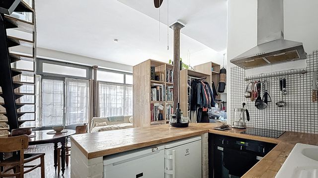 A41759LUM75 - LAMARCK-CAULAINCOURT METRO – Montmartre, atypical duplex apartment of 74.2 m² in a well-maintained period building, converted from a former shop into an artist's studio. Bright, quiet, and spacious, it features high ceilings, exposed beams and stone walls, cast-iron columns, and authentic Parisian charm. Access via the main building (raised ground floor), directly from the street for easy entry, or from the upper level. The raised ground floor includes a garden-facing bedroom, functional open-plan kitchen with bright living area, bathroom with WC, and laundry. Upstairs: garden-facing bedroom with large adjoining dressing room leading to shared areas, Italian-style shower room with WC, and an office or guest space with open views. Private cellar. A unique blend of light, calm, and character in the heart of Montmartre, close to shops, restaurants, and transport.