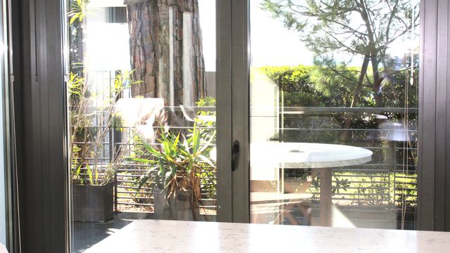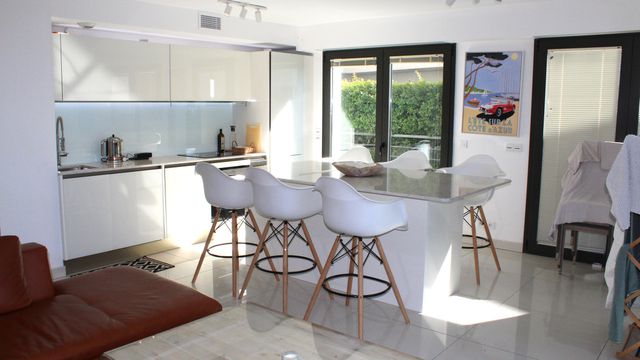 A35778SIM06 - EXCEPTIONAL LOCATION in Juan les Pins for this elegant recently built modern ground floor BEACHFRONT apartment in a HIGH QUALITY PRIVATE RESIDENCE with two double beds, two baths, secure garage. RARE opportunity.