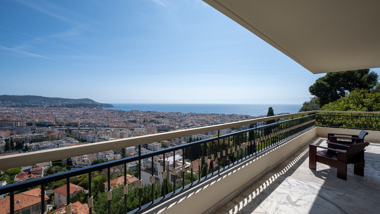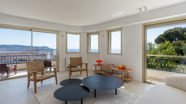 A40712ATB06 - Panoramic sea and city views with a view extending as far as Cap Ferrat. from this superb 102 m² 4-room apartment with its spacious terrace. This exceptional property has undergone a high-end renovation, providing refined, bright, and modern amenities.