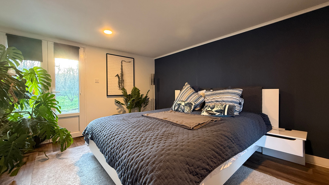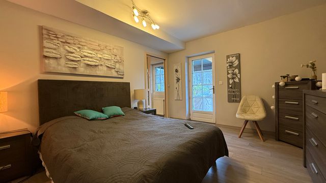 The main house provides approx. 176 m² of living space with a spacious kitchen, cozy living room with fireplace, bathroom with bath and shower, and four bedrooms including one with dressing. A versatile 20 m² room completes the layout.