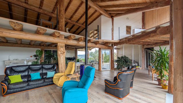 The main living space impresses with its volume and light. A cathedral ceiling, exposed timber frame and full-height high-performance windows create a bright, open-plan area with seamless indoor-outdoor flow. Open kitchen, office space, utility/laundry room and WC complete this part. Heating is provided by a wood-burning stove, supported by a double-flow ventilation system with ground air heat exchange.