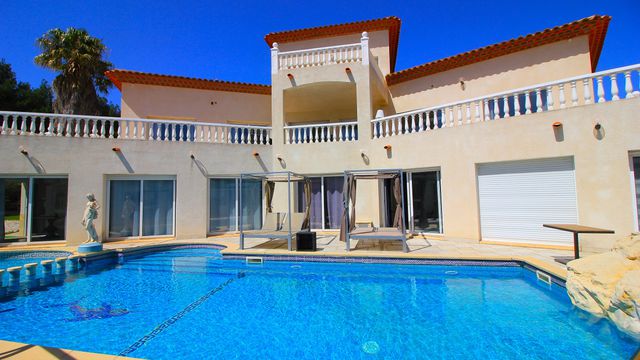 A28788CST11 - Discover this exceptional luxury villa with panoramic views of the Etang de Bages and the Med.Built 30 years ago, this property offers 550m2 of living space on a beautiful 4127m2 plot. The luminous lounge with fireplace, sleek fitted kitchen, and elegant dining room all open onto a stunning terrace overlooking the heated 16x5 Greek-themed pool and summer kitchen. A private 52m2 apartment ,two bedrooms 2 shower rooms , provides extra income opportunity. Ascend to the first floor bedroom with terrace, dressing room, and shower room.The ground level features a fabulous master suite of 70m2 with two dressing rooms, ensuite bathroom, and hammam. Enjoy a cinema room, bar, and games room opening onto the pool area. Below, find a private wine degustation cave and a 500m2 garage space. Exterior features include shaded gardens, petanque pitch, beach volleyball court.A separate annex with four ensuite luxury bedrooms for income potential . Full measurements ,photos available upon request.
