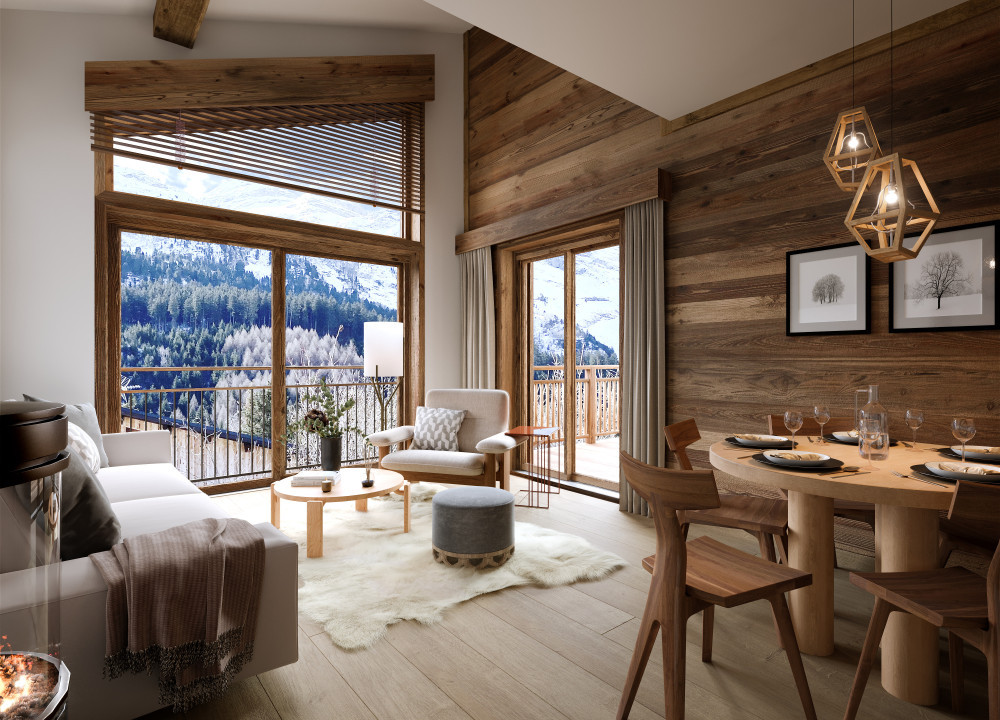 A36045DMD73 - Located in a quiet yet central location Pralognan la Vanoise, this beautiful, new build 81m2 apartment with spacious balcony of 14m2 consists of: Entrance hall leading into the bright, open concept kitchen - living room facing south west onto the balcony.