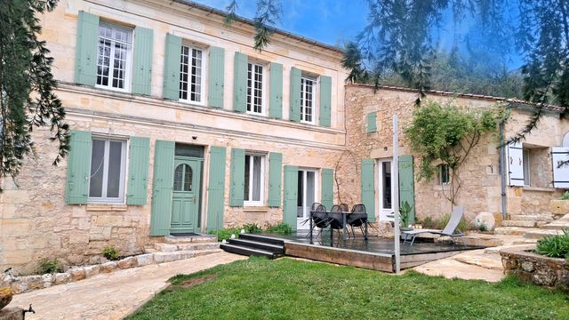 A40519MGD33 - Exceptional stone property comprising 4 bed main house plus separate gite/guest house, outbuildings/hangar & almost 1 acre of land. In the main house, entrance hall, large lounge with fieplace, beautiful dining kitchen, 4 bedrooms, 2 bathrooms, office/mezzanine, courtyard. Separate 1 bed (possibly 2) gîte with good rental potential. Large outbuilding. Stunning views. Near the village of La Rivière, close to Fronsac & Libourne.