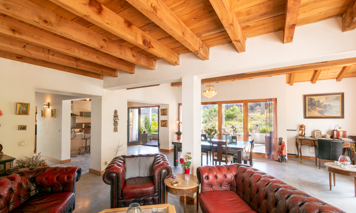 A covered 60 m² terrace invites you to enjoy outdoor living year-round. Practical features include a 100 m² double garage, laundry room, dressing rooms, sauna, wood burner, pellet stove, natural spring water system, and certified septic tank.