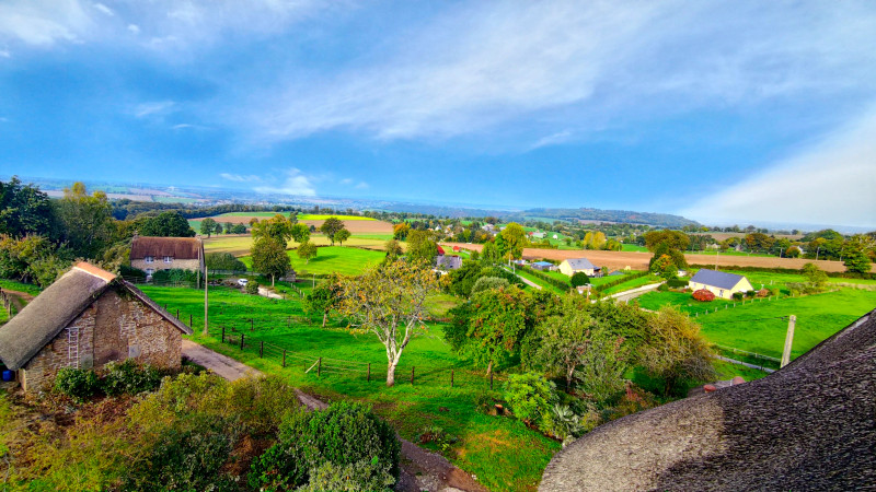 The property is nestled just below the brow of one of highest points in Normandy overlooking the old chateau of Mont Cerisy with the high point view at Mont Pincon. There are here simply extraordinary panoramic views. Situated just an hour from the port of Caen at Ouistreham it is convenient.
