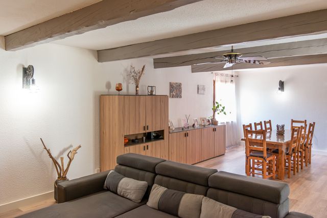 A31152JAV11 - Charming bungalow built in 1992, located 650 meters from the village center of La Palme and an 8-minute drive to the beach. Set in a peaceful, natural environment with no direct neighbors, the property includes 4250 m² of fully fenced land, with 50 m² buildable space. Recently insulated, renovated bathroom. Features double glazing, gas central heating, reversible air conditioning in the living room, and wooden shutters. Connected to city water, equipped with a septic tank, and fiber optic internet. Interior: entryway (10 m²) with built-in closet, three bedrooms (11,5, 12 and 12,5 m²), bathroom (9 m²) with large walk-in shower, spacious living room (42 m²) with open kitchen (10,5 m²), and sliding glass doors leading to a 52 m² terrace. Additional: three small outbuildings (6-10 m²) and a well (water contains 0.1% salt), and an 18 m² basin (60 cm deep) connected to the well (ideal for keeping fish), two dog kennels, an aviary, and a chicken coop. Potential to build or add horse stables.
