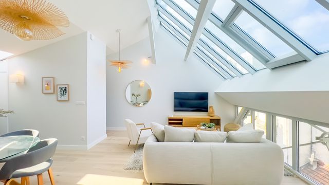 A24899DPE75 - Paris 75016 - Between Champs-Élysées and the Eiffel Tower - 95,56m2 - Exceptional top floor 2 bed fully renovated apartment in a stunning new renovation of a 1901 building originally conceived as artists' studios. This duplex loft style apartment, nestled behind a superb timber-framed facade with glazed rooves bathing the generous spaces below in light, offers a unique environment oozing Parisian chic at the heart of the Trocadéro district. The residence astutely blends the building's original artistic vocation with the über-modern, high-quality, environmentally friendly living sought by discerning 21st century buyers. The 5th floor sleeping area includes an entrance hall, 2 bedrooms, 2 bathrooms, WC and laundry. The 6th and top floor features a living room with a new contemporary, fully equipped open-plan kitchen and WC. Huge windows in the main rooms give an unobstructed view of the discreet, leafy, cul-de-sac, a rare privilege in such an exceptional location in the French capital.