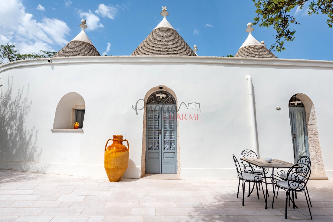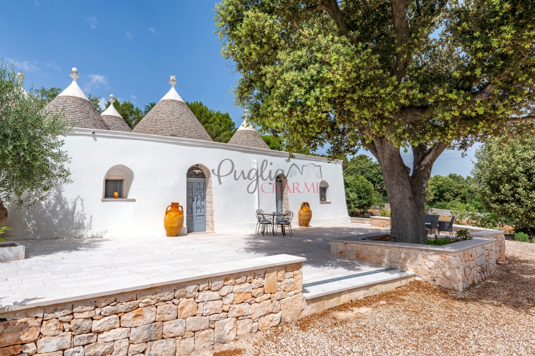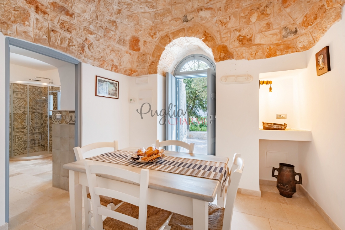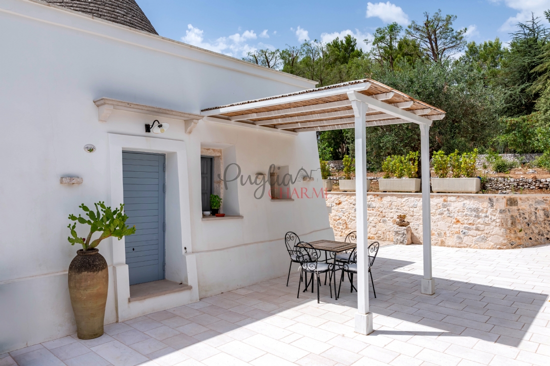 En el exterior, el parque circundante se despliega en toda su cautivadora belleza, repleto de olivos centenarios y rodeado de muros de piedra seca, magistralmente restaurado según la tradición de los maestros constructores de trullos.