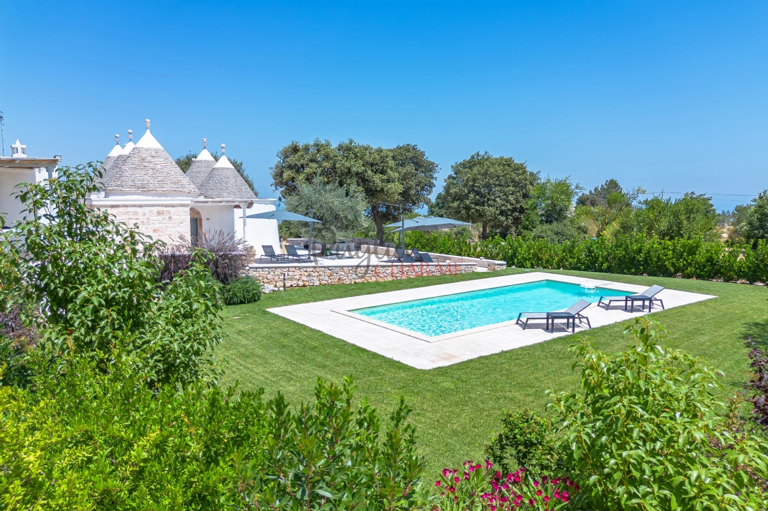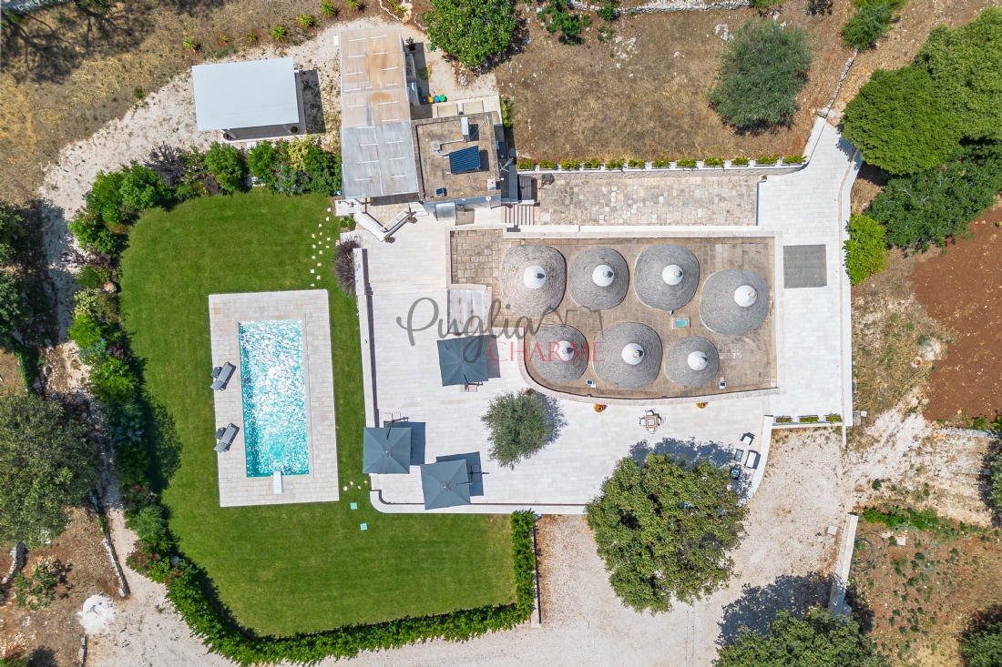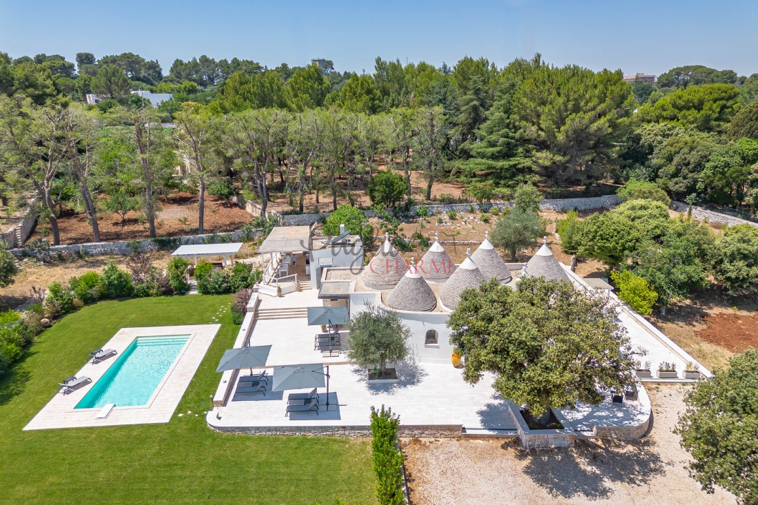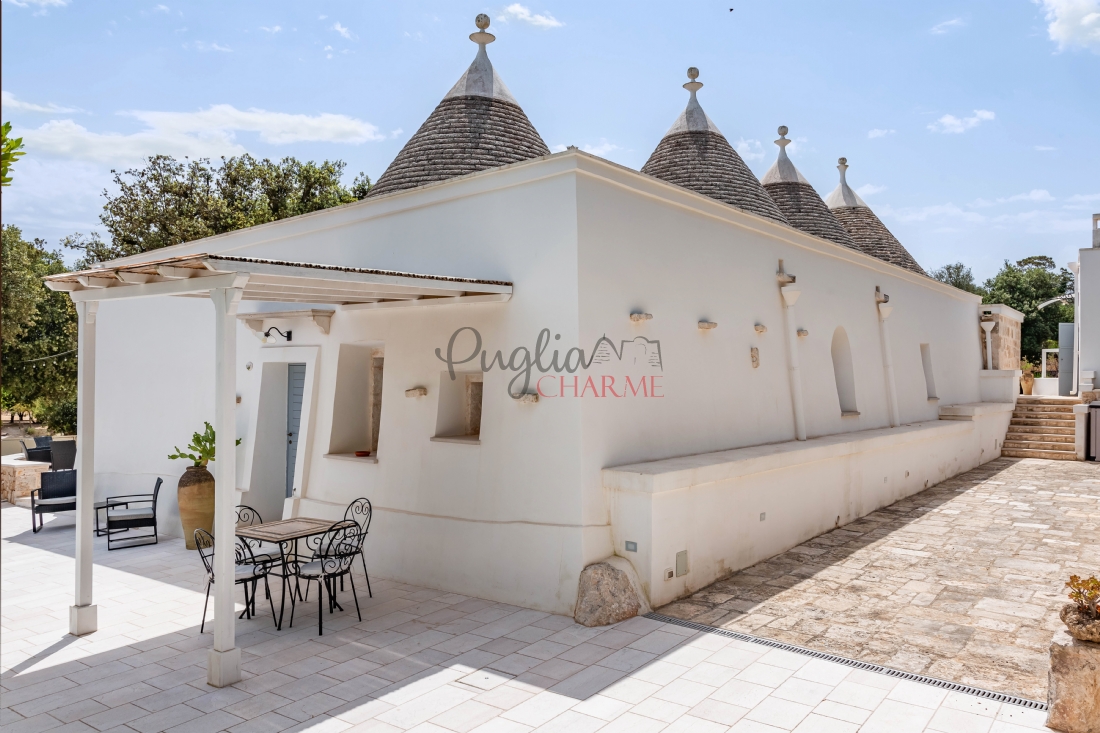 En el exterior, el parque circundante se despliega en toda su cautivadora belleza, repleto de olivos centenarios y rodeado de muros de piedra seca, magistralmente restaurado según la tradición de los maestros constructores de trullos.