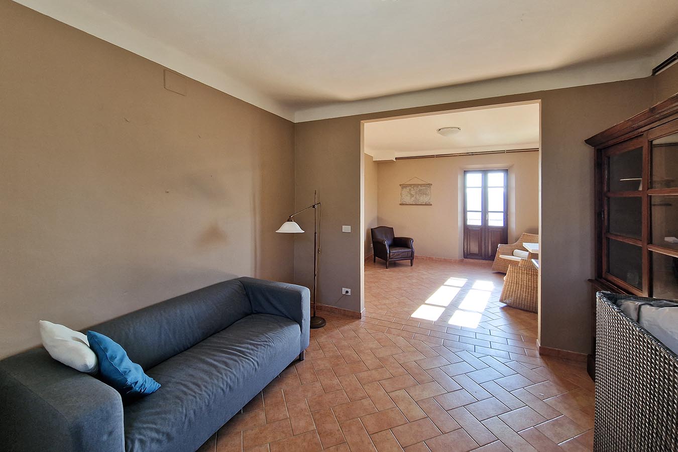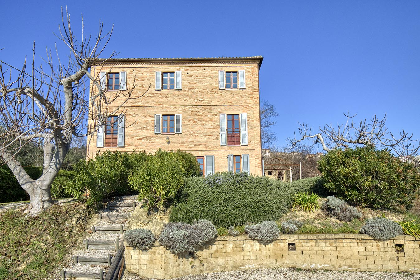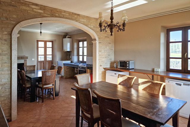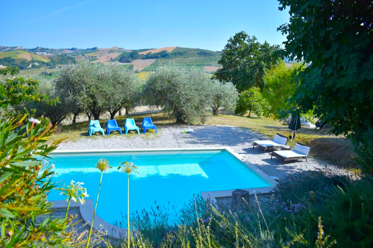 Stately former farmhouse with swimming pool, spread over three floors with a storage room to be renovated, a total of 345 m2, and spacious paved terraces overlooking the beautiful rolling countryside and vineyards. The villa is located on a well-kept garden with some fruit trees and an olive grove of about 30 trees that produces an average of 30 to 60 liters of organic extra virgin olive oil per year. Located in a sunny spot with a beautiful view of the typical landscape of Le Marche, there is a beautiful swimming pool of 9 by 4 with sufficient terraces.The living area of Villa Moltini is divided on three floors: