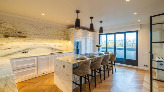 A28358HHE75 - Idéalement situé face au Champ de Mars avec vue Tour Eiffel depuis son balcon. Rénové par architecte en 2024, cet appartement d'exception de 265 m² offre un design contemporain et du marbre italien. Salon et salle à manger avec grandes baies vitrées, cuisine gastronomique avec îlot et équipements Gaggenau. Rare à Paris : 4 chambres de taille similaire, chacune avec dressing et salle de bains. Entrée privée par ascenseur, trois caves et parking au sous-sol. Climatisation complète et note énergétique A témoignant de l'excellence des prestations. Un lieu de vie d'exception au cœur de Paris.